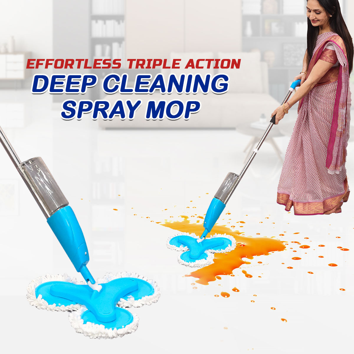 Introducing the Effortless Triple Action Deep Cleaning Spray Mop, a practical solution for your cleaning needs. This innovative mop features triple action heads and a convenient liquid dispenser for efficient floor cleaning